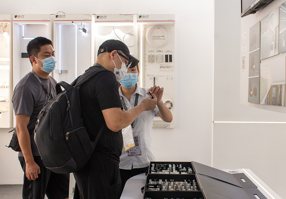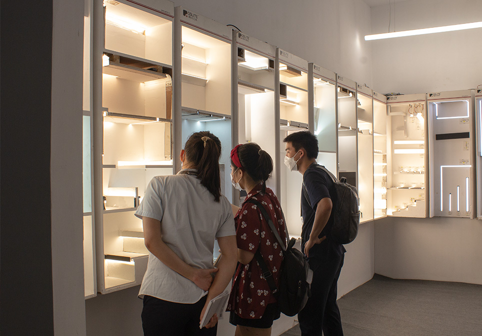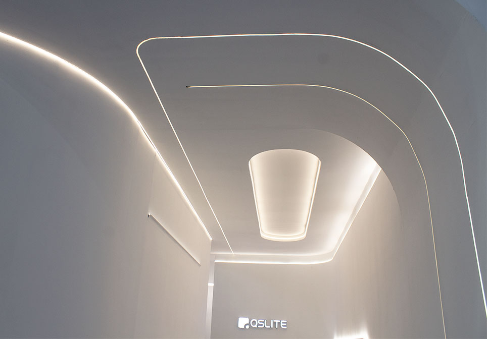 弧形元素使整体外观简约而高级,走道展示自由弧成品灯具,提升整体展厅的颜值,增加视觉艺术效果